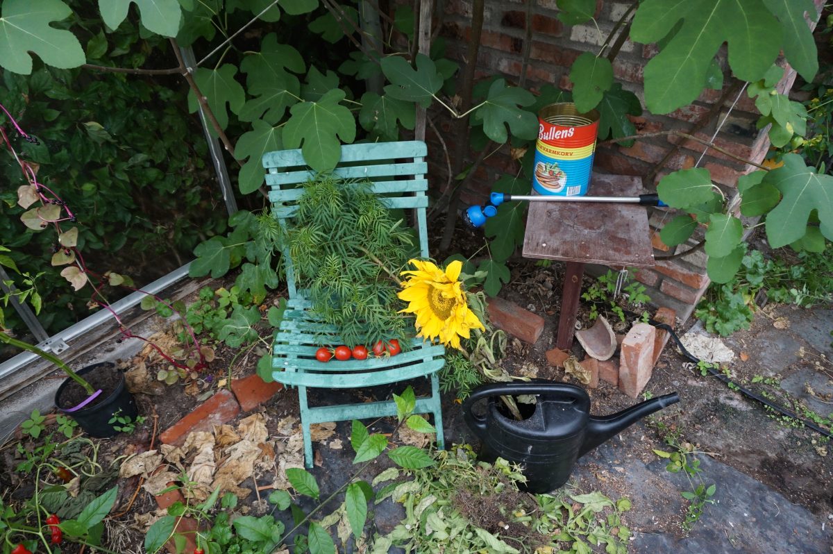Jag har en enkel, nedgrävd, timerstyrd bevattning som jag drar upp och rengör inför nästa säsong. Under vintern behövs så lite vatten så att vattna med kanna är enkelt. Bevattningsslangarna måste också upp för att jag ska kunna gräva små diken som jag fyller med kompost, bokashi, gräsklipp med löv, tång och kanske något mer innan jag planterar försådda plantor och sår nytt. Mer om vinterodlingen i kommande inlägg om växthuset.