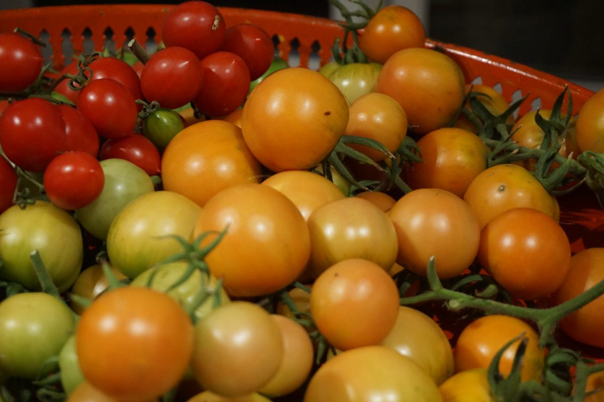 Det är fortfarande många tomatklasar kvar att klippa ner och alla tomater, även de gröna tas in och får ligga och eftermogna på ett hopfällbart ”skördebord” mitt i vardagsrummet tillsammans med aubergine, squash, chili m.m. De tomater som klarar sig längst utan att spricka eller säcka ihop och bli förökningsplatser för småflugor är vintertomaten Ponderosa och en lite större piennolotomat utan sortnamn.